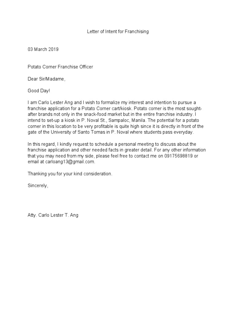 Letter Of Intent For Franchising