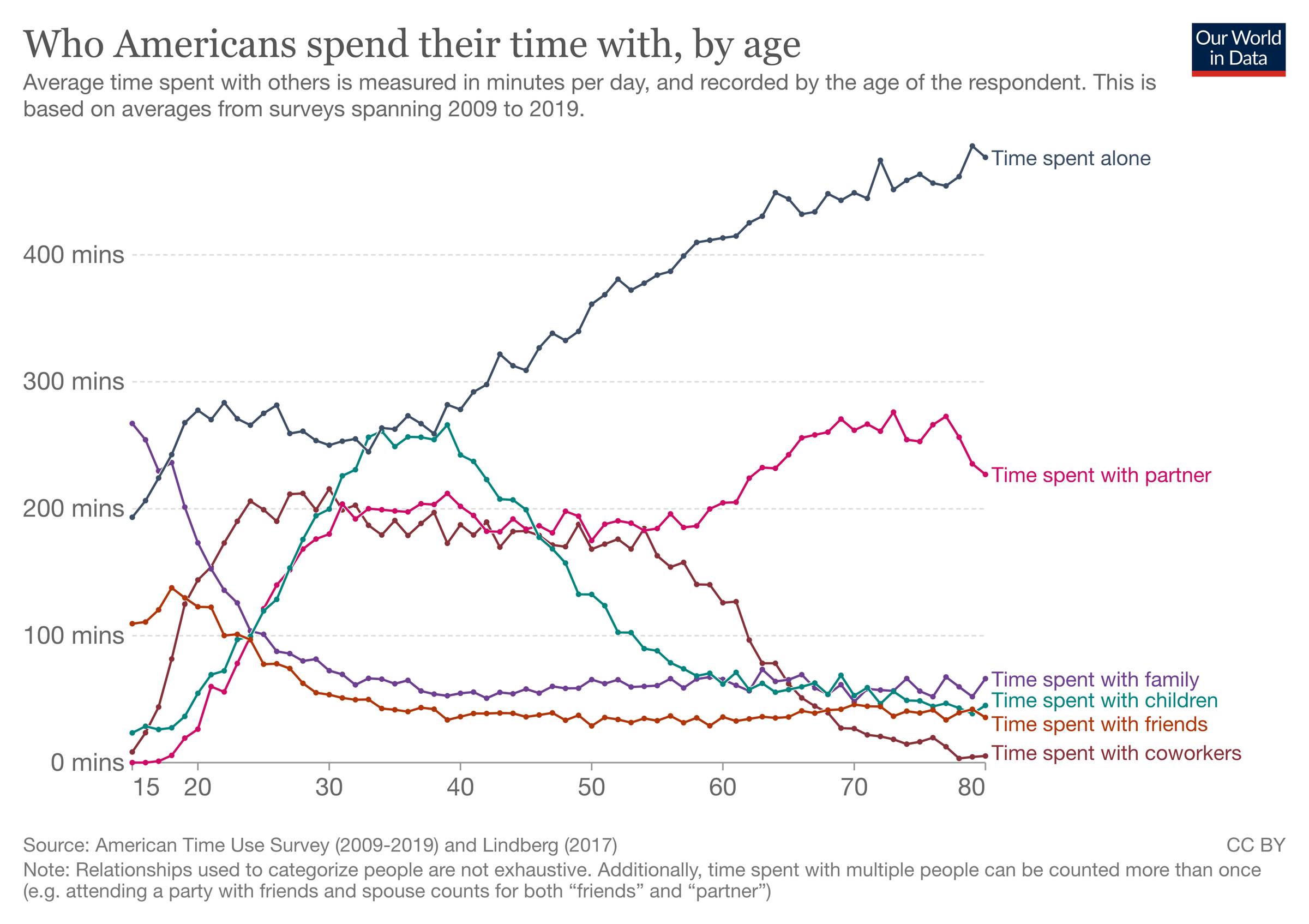 One of my key takeaways from looking at this chart is that most people spend the majority of their time after 40 with their partner and with themselves. That has two practical implications.